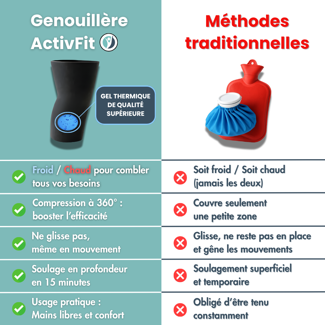 La genouillère ActivFit® combine froid/chaud uniforme + compression 360°, ce qui permet :