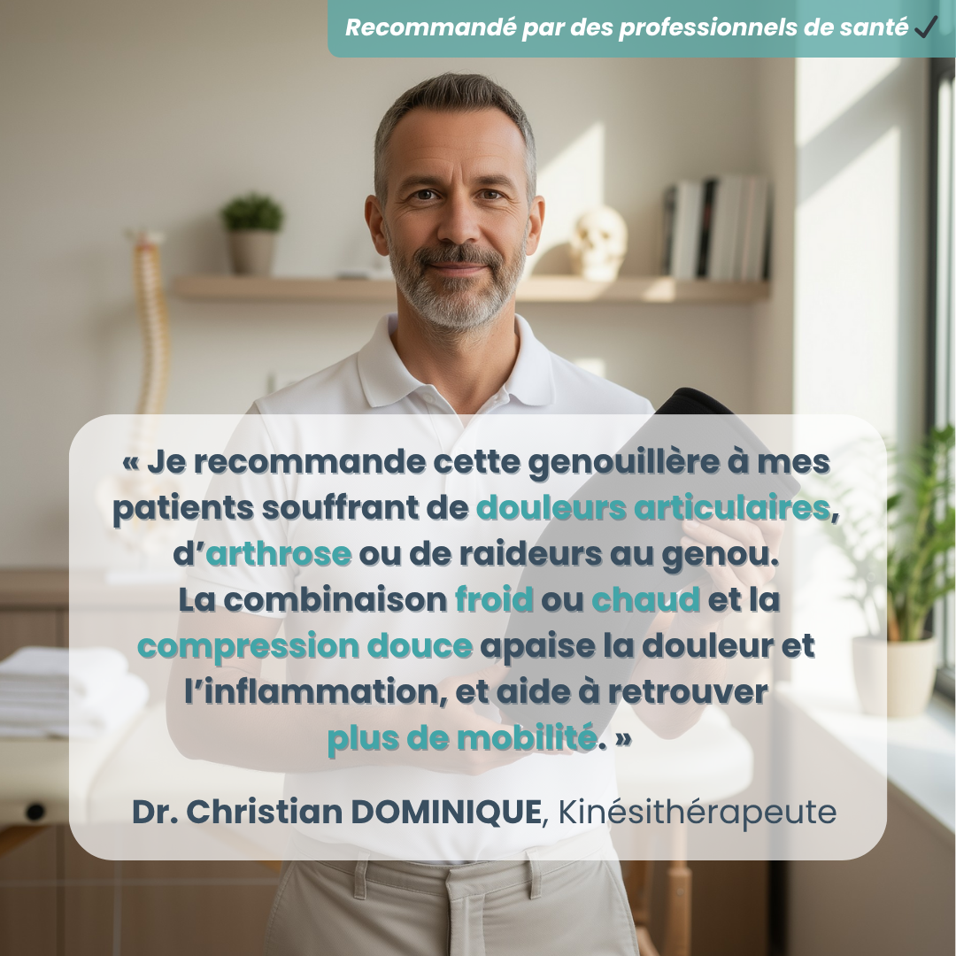 Une poche de glace ou une bouillotte soulage seulement en surface, car elle n’entoure pas totalement l’articulation, ne reste pas constamment appliquée contre la peau et la douleur revient rapidement.
