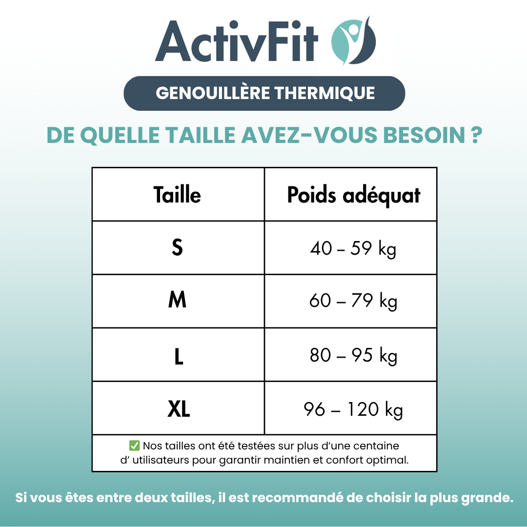 Cette genouillère est disponible du S au XL (convient aux personnes de 40 à 120 kg).